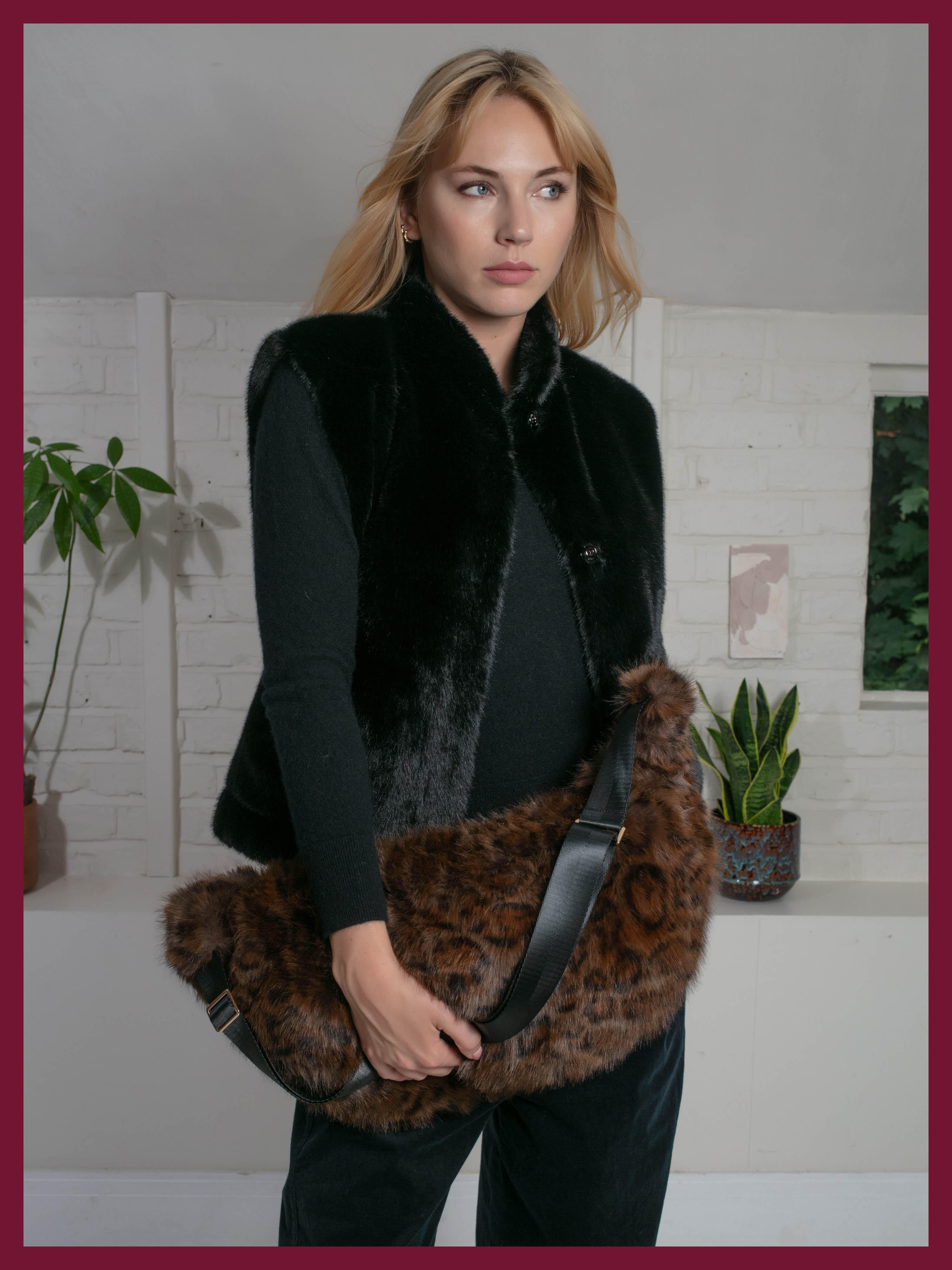 This cosy faux fur bag flaunts a trendy leopard print in the season’s favourite chocolate shade.