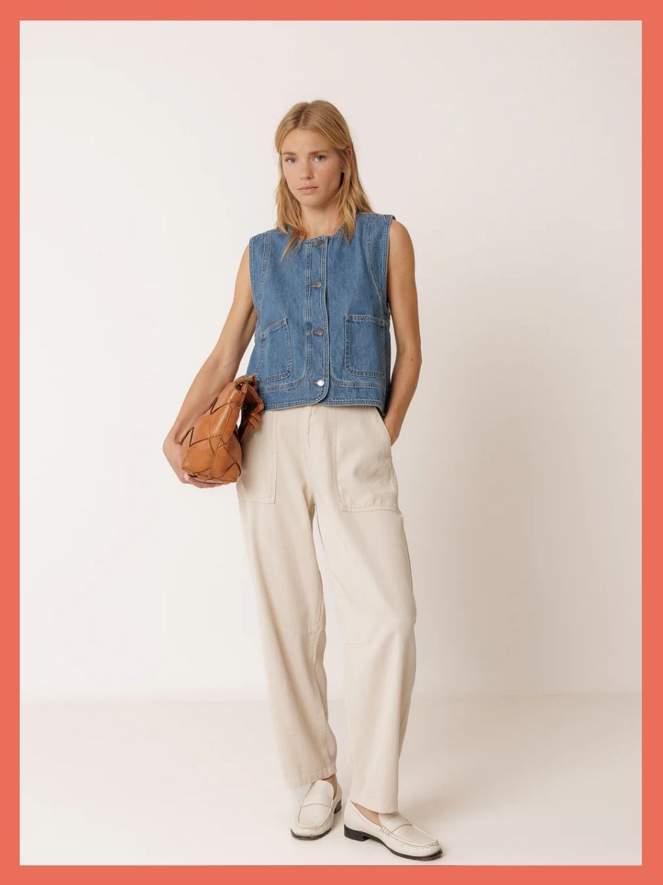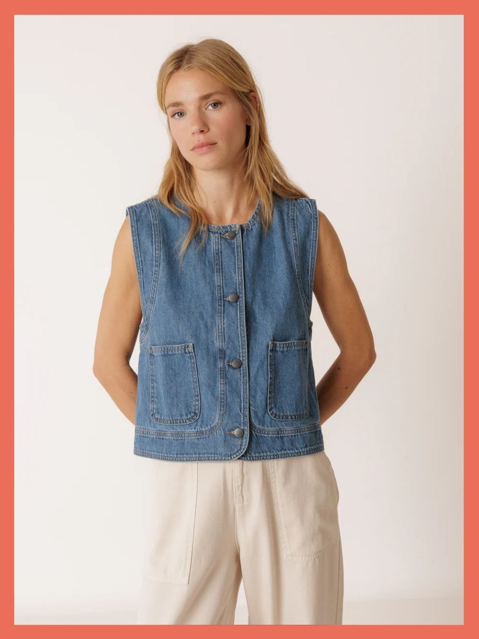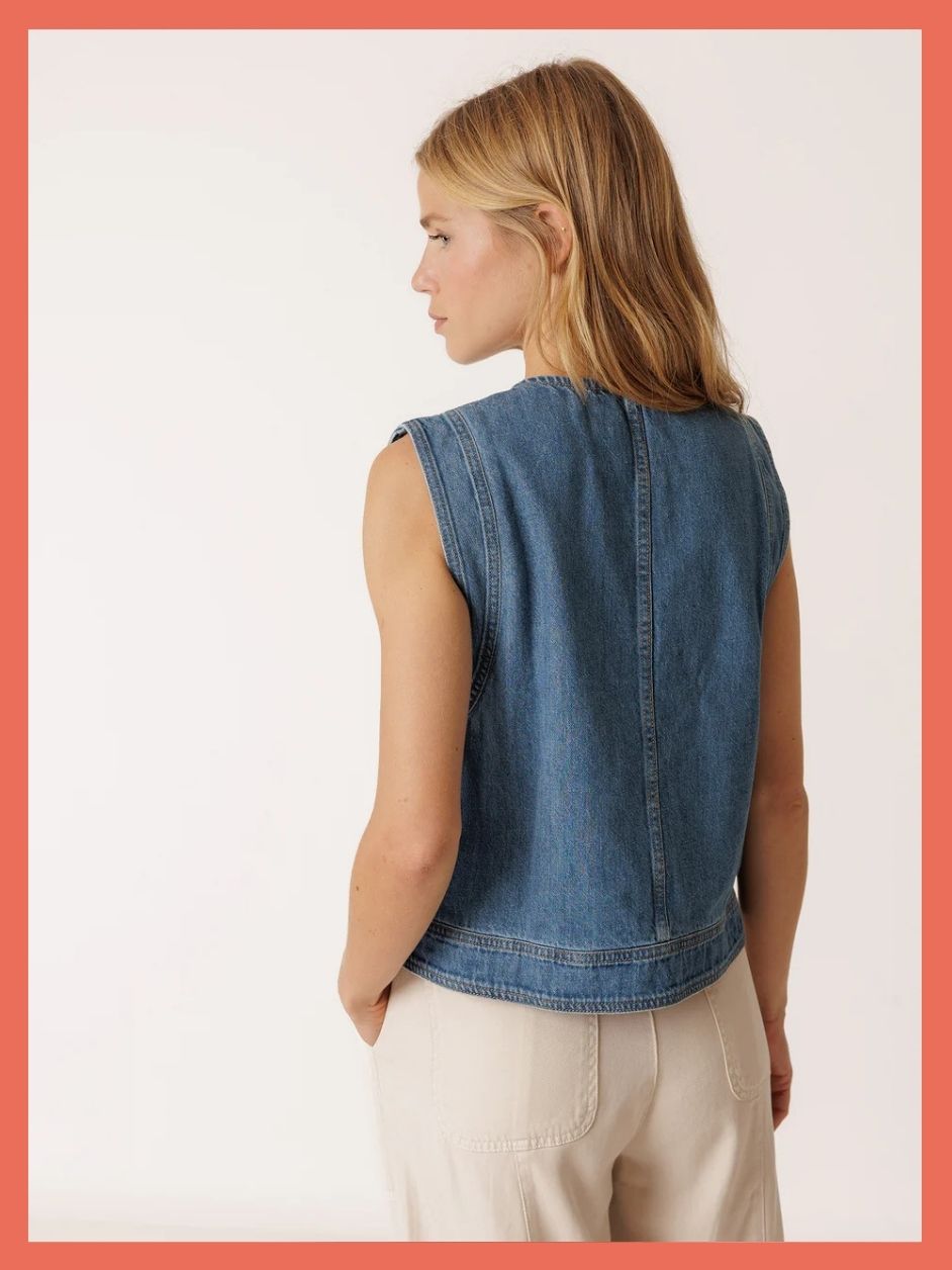 Straight-cut denim vest with front patch pockets and button closure. The regular fit makes it comfy and easy for everyday wear.
