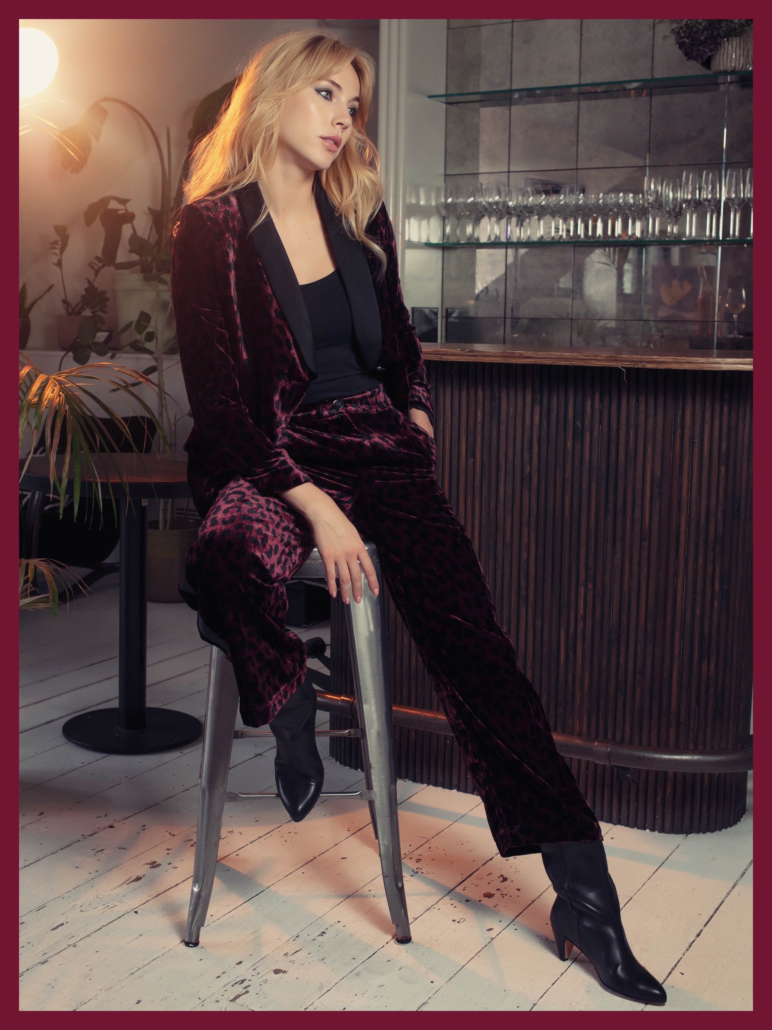 - The Sonia Tuxedo is the most stylish piecce in the whole collection, in rich plum velvet with striking leopard print. WIth a satin lapel for a smooth, sihouette