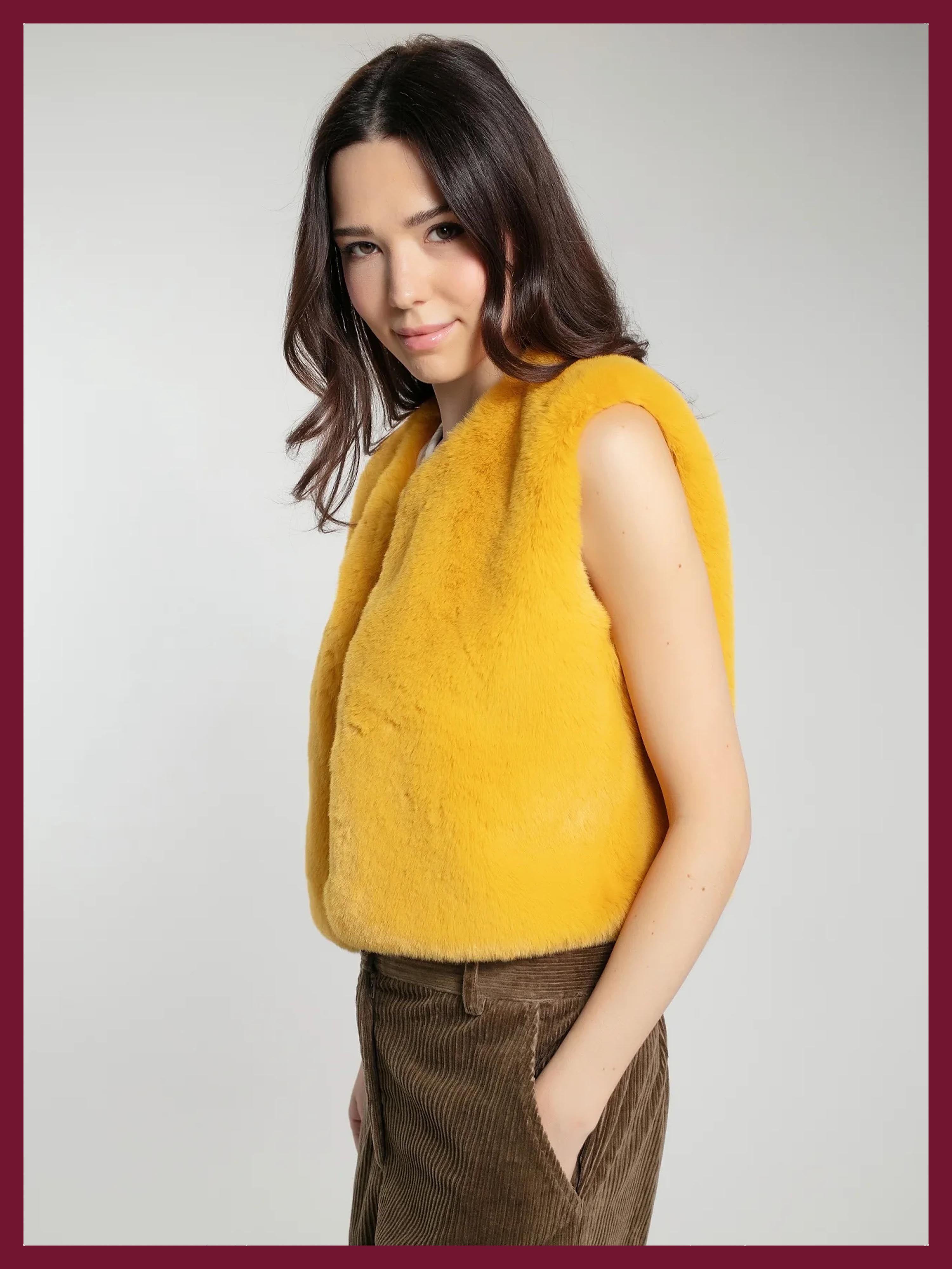 Our Edelweiss Gilet is back and better than ever this season! A staple in our autumn and winter collections, this luxurious faux fur gilet adds a touch of glamour to any outfit. Available in three stunning shades—Black, Mink, and Mustard—it's designed to elevate your winter wardrobe with its timeless elegance.