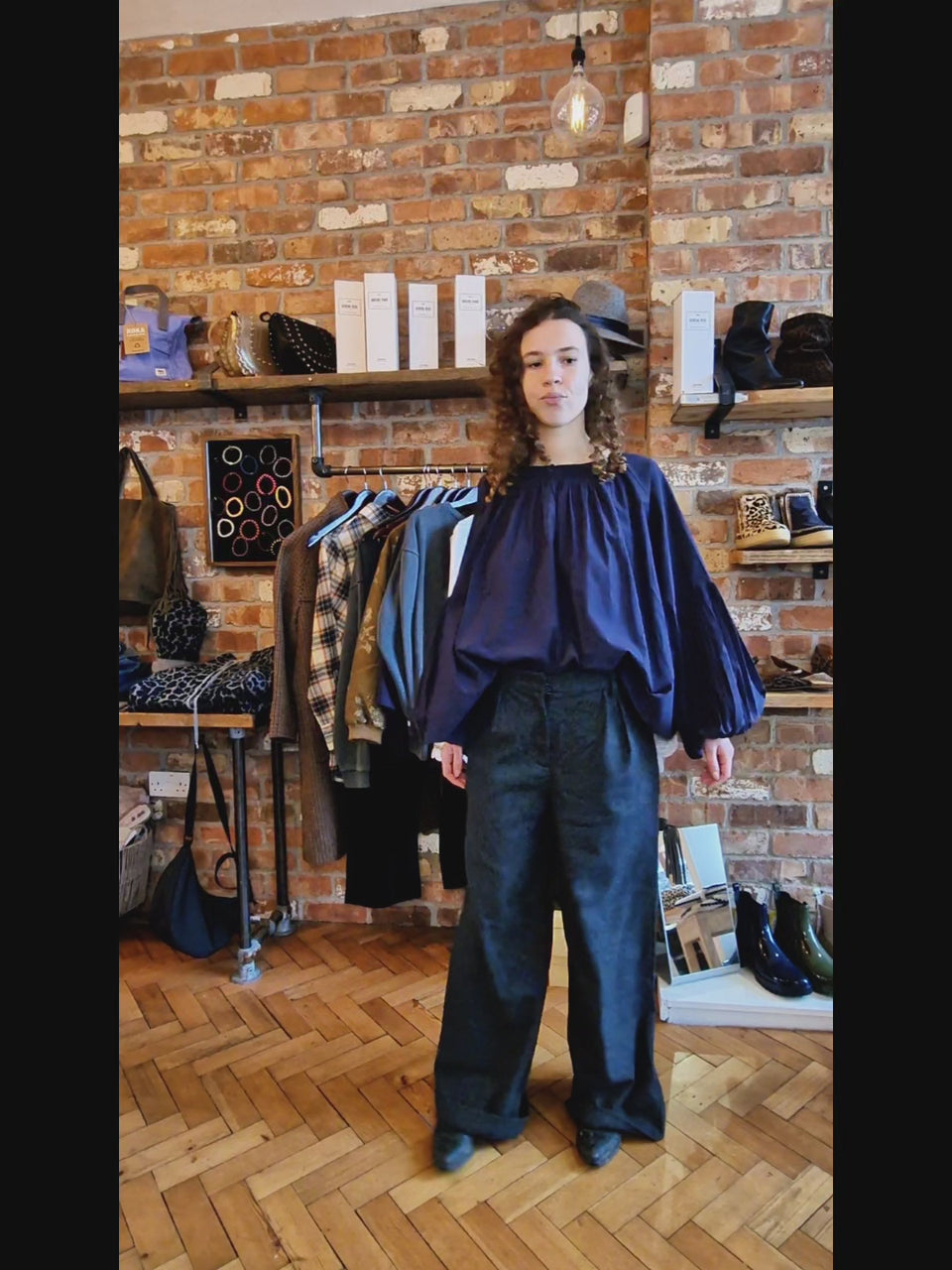 Wide and flowing blouse in an easy and stylish navy colour-way. The blouse features a ruched wide boat neckline and ruched sleeve cuffs on the wide balloon sleeves. A relaxed and versatile piece, that can easily be dressed up or down.