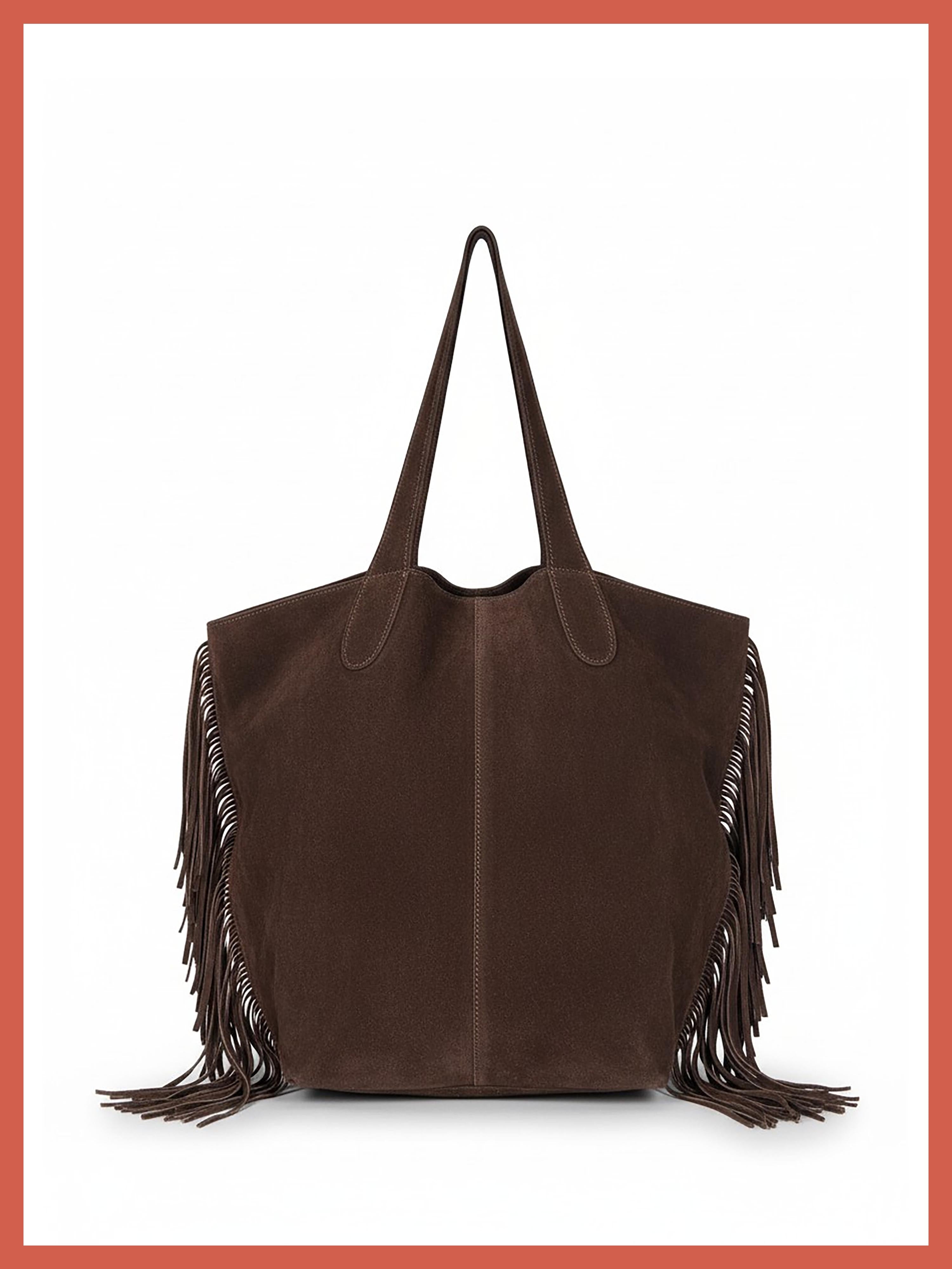 - This larger style of bag offers a distinctive blend of luxe and classic tyle with a supersoft suede leather and detailed side fringe, givign it a bohemian feel.